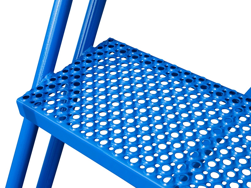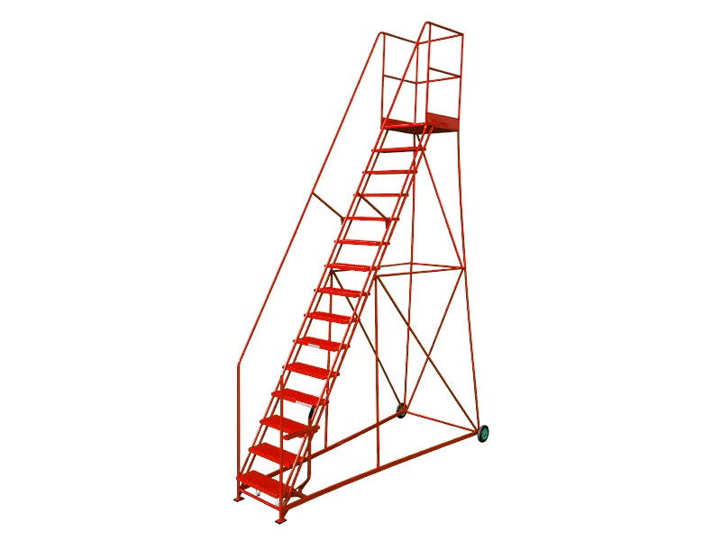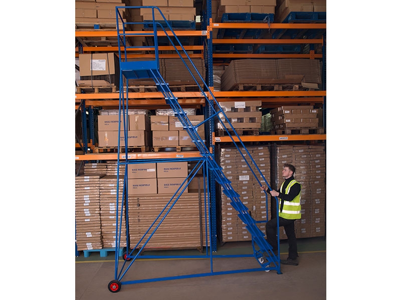 16 tread, welded steel construction steps. Platform height: 3659 mm. Overall dimensions: 4610(H) x 1295(W) x 3010(L) mm. Fully welded steel construction manufactured to industrial standards. Load tested to LEEA standards (details below). Hand activated locking lever brake. Rubber or non-slip punched metal treads. Safety toe plate on 3 sides of the platform. Safety support hand rails. 560mm wide steps, with platform 610mm wide x 585mm long. 2 standard colours available. RAL colours available (call for details) – just 10% more + additional 5 day delivery.
