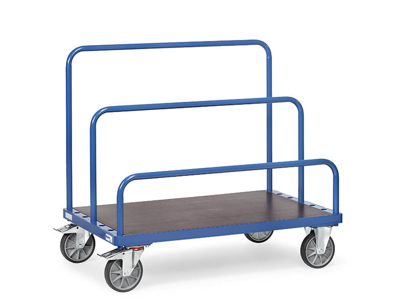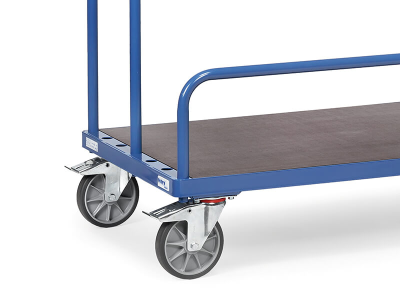 750 or 1200kg Capacity. Tubular steel and profile steel welded construction. Platform made of derived timber material board with a beech grain surface. Trolleys have 2 braked swivel & 2 fixed castors. 7 positions for insertable tubular supports. 90mm clearance between support positions. Tubular supports sold separately, please see accessories table below. Powder coated blue RAL5007 finish.