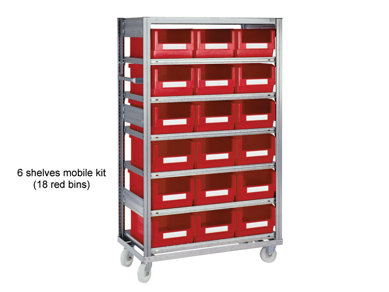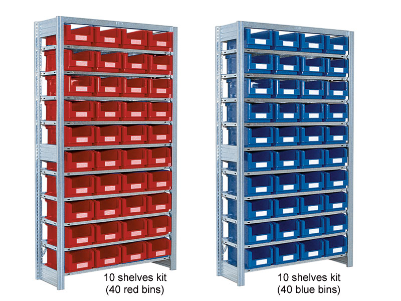 Boltless shelving complete with storage bins. 6, 7 and 10 shelf bays. Shelf load 50kg, bay load 500kg. 6-shelf unit fitted with castors. The Shelving Container Kit has a 2 year warranty. Bins are available in blue, green, yellow, red.