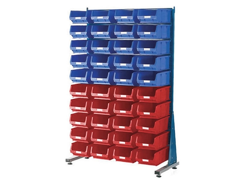 Adaptable freestanding rack that can store generous number of tools, products, or materials. Single sided with 40 size 4 bins included. Bin dimensions (mm): 132(H) x 205(W) x 350(L). Available with red or blue bins or a mix of both colours.