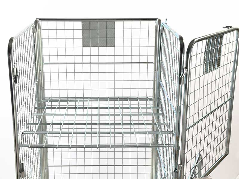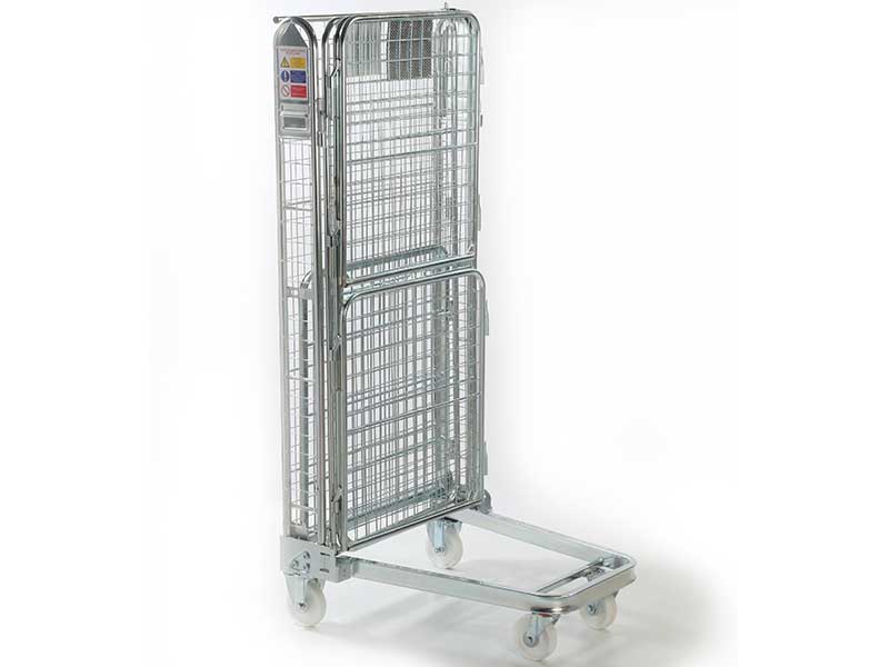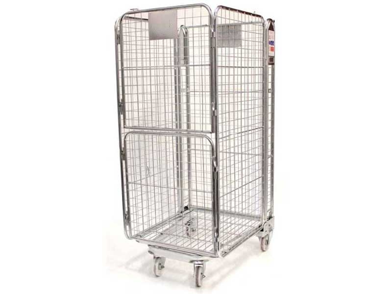 Security “A” frame nestable roll pallet. Dimensions 1690(H) x 735(W) x 850(D). Capacity 600 kg. Four sided with 50mm mesh infill to all sides. 2-piece hinged front gate. 2 fixed & 2 swivel 125mm nylon castors. Bright zinc plated finish. Platform 735 x 850. Reinforced robust design.