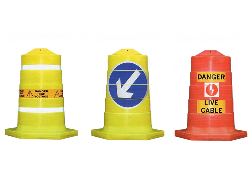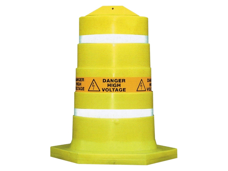Upright cable cover for high voltage hazards. Provides a highly visible warning to the public. The covers are hollow and rotationally moulded for placing over exposed cable. Has a sand ballasted base to ensure stability. Weighs 17.2kg. 1170mm High (base hexagonal 710mm x 710mm). 3 options available: high voltage (yellow); keep left; live cable (red) – see table below.