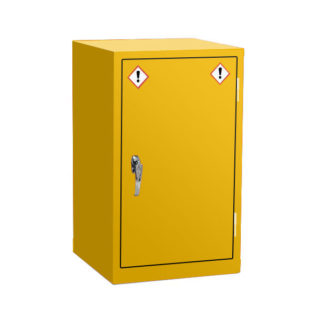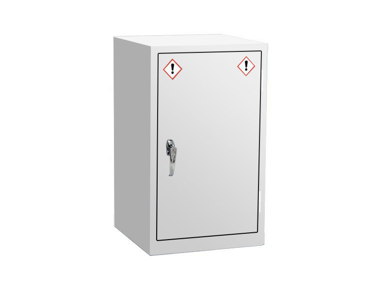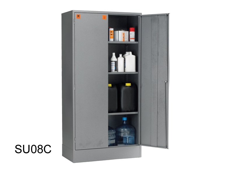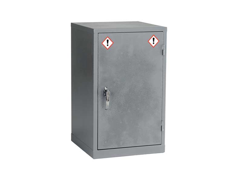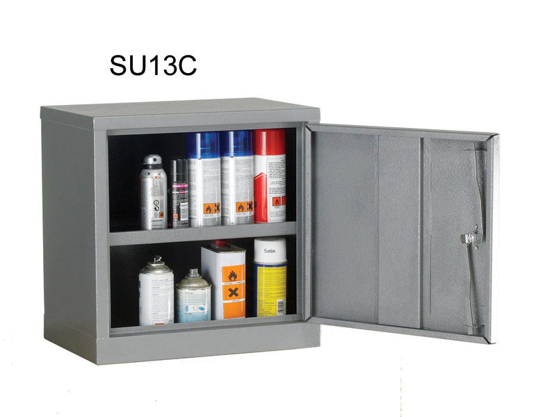 Seam welded steel construction. 0.9mm and 1.2mm mild steel. Built-in sump. Adjustable shelves on 25mm pitch which also act as a 25mm deep spill tray. Reinforced doors with 2 point locking. Hazard warning signage. Standard colour Grey. Fire resistance of 30 minutes. Dangerous Substances and Explosive Atmospheres Regulations 2002 (DSEAR). Paragraphs 94-96, along with appendices A & B paragraph 104 in the DSEAR ACoP L136. Factory Inspectorate Certificate of Approval No 1, parts 3 and 4. HSE Guide HSG51.