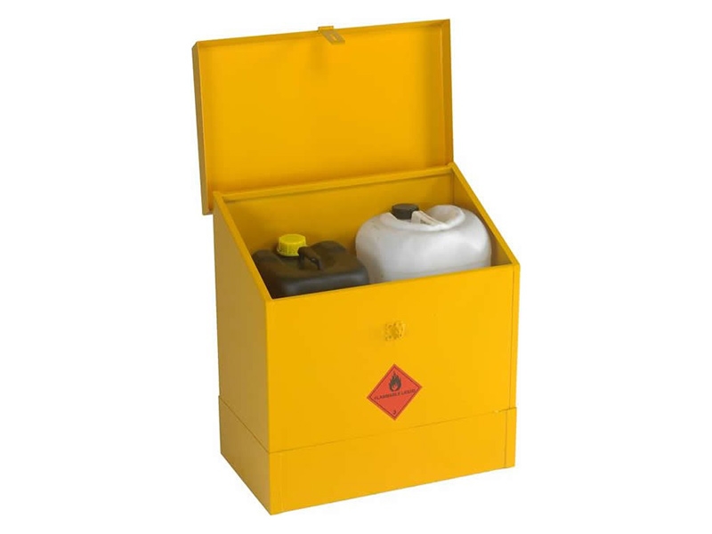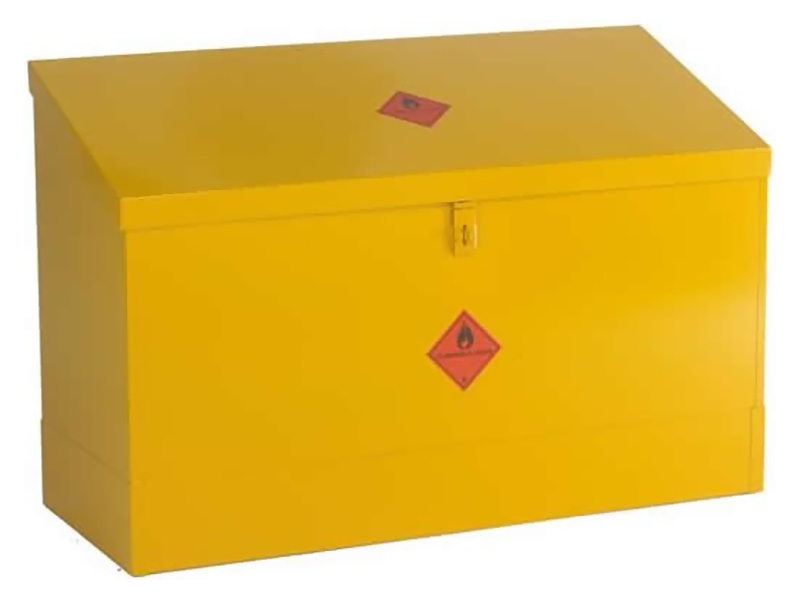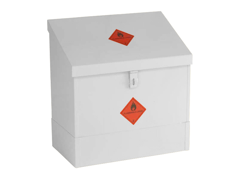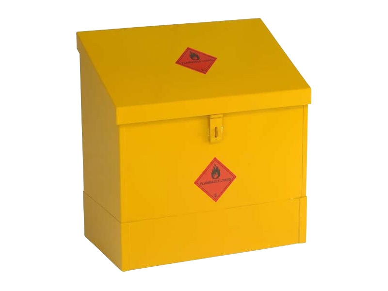 Flammable storage sloping top bin with sloping lid. Contains flammable items that can be dangerous to store in the open. Designed to comply with current UK legislation. Seam welded steel construction. 150mm deep interior. Complete with the appropriate warning signage. Box can be padlocked (lock is not included).